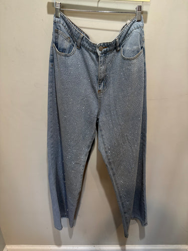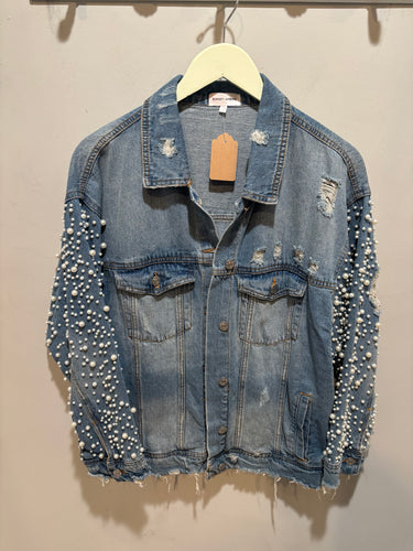 Light Wash Distressed Pearls Sleeves Denim Jacket