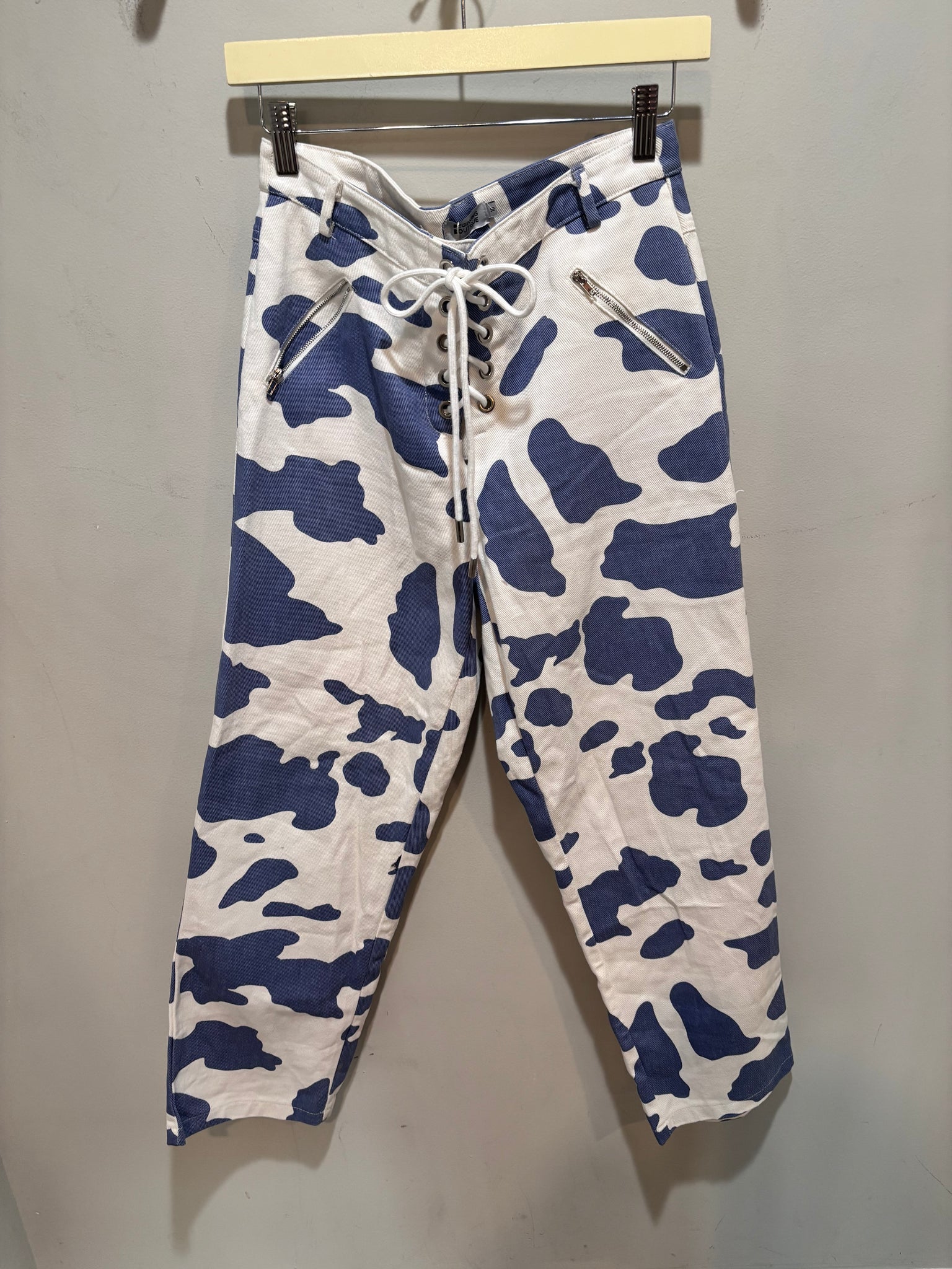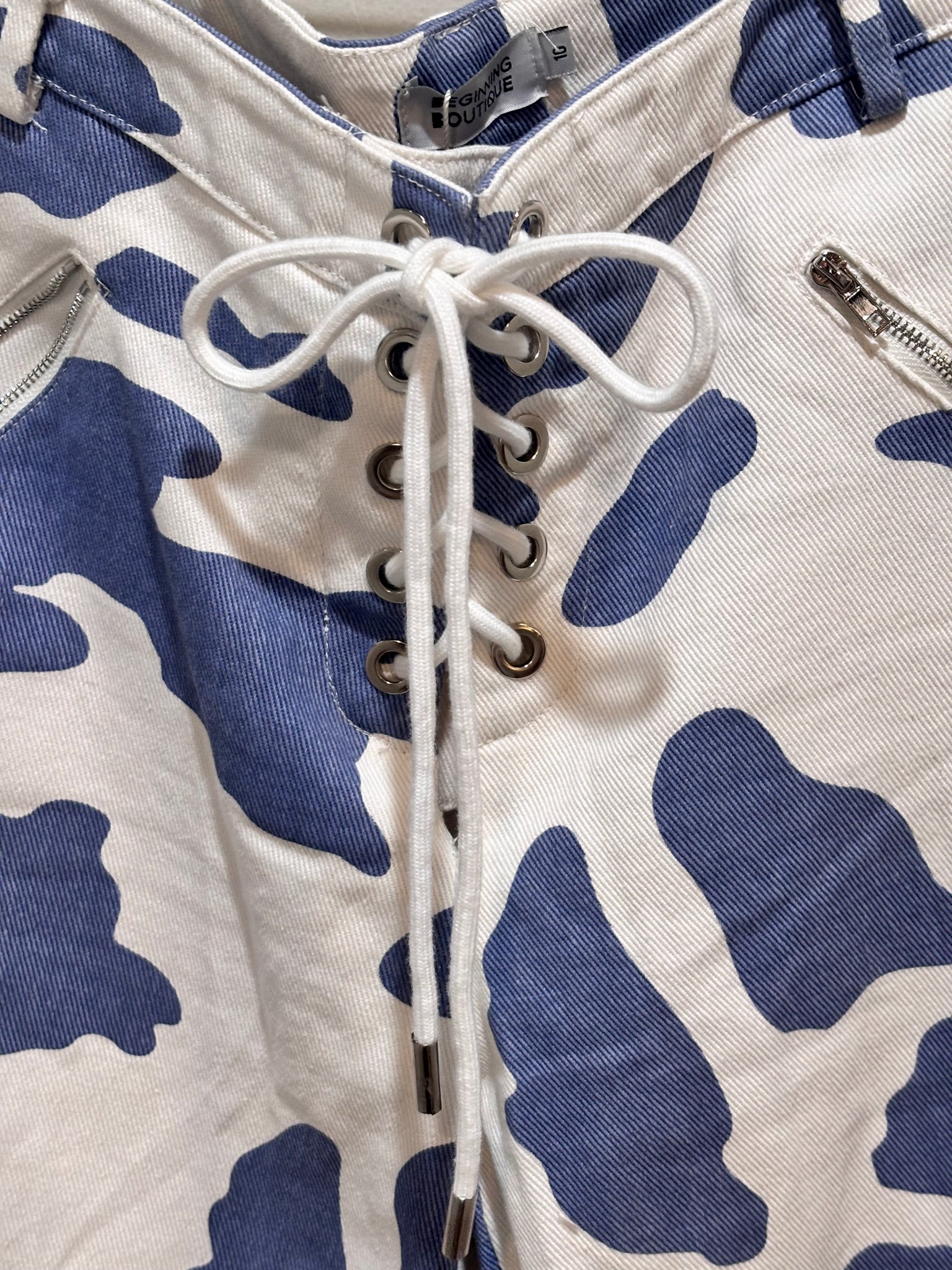 Blue White Cow Pattern Lace Up Pants